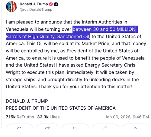 - Crude Drops After Trump Says Venezuela Will Transfer Up To 50 Million Barrels To USby Tyler Durden on January 7, 2026 at 1:35 am